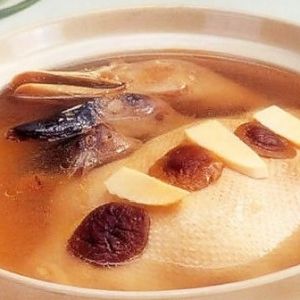 与香菇25克、火腿片25克,笋片50克,间隔排在鸭身上,放入精盐再焖半小时即可上桌。