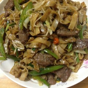 热锅下油、放河粉大火炒一分钟左右、加小许盐、生抽、最好拿筷子划散、免得河粉炒断,然后放入牛肉、还有豆芽等、再加上小小蚝油、葱花。炒匀即可上碟
