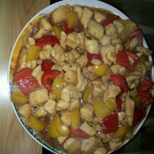锅中留极少油烧热,姜末蒜末爆香,加入彩椒翻炒3--4分钟,加入鸡肉丁翻炒均匀,倒入调好的汁,炒至汤汁粘稠盛盘。