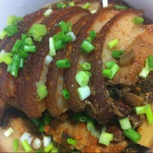 五花肉一块,将表皮处理干净,冷水入锅,倒入一汤勺料酒可去肉腥味,把肉煮熟就好了,然后取出在表皮涂上酱油,炒锅倒油把扣肉炸一下,炸焦黄就好了,取出冷却一会将肉切片,切5毫米左右就好,取一深碗,把肉放入摆好,皮朝下,肉上放几片生姜和几粒蒜头备用