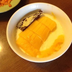 取出起皮的牛奶、倒入蛋清夜碗中(注意牛奶不要全倒干净、在皮下留一点牛奶)、搅拌均匀牛奶和蛋清夜、可再适量加白糖、都要搅拌均匀哦