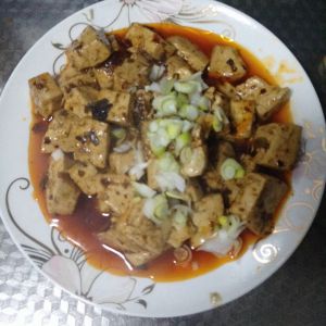 锅里放油,放入葱姜炒香,放老干妈炒香放点水,倒入豆腐快速翻炒,稍微多煮一会儿入味,放适量五香粉,盐,胡椒粉