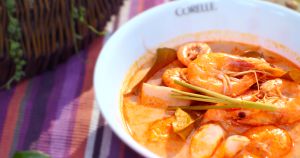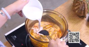 煮汤,在锅中放入冬阴功酱,下鲜虾,煮到虾变红,煮虾一定要掌握好时间,不要煮太久,时间长了,虾肉会老,影响口感和味道。最后加椰浆和鱼露调味。