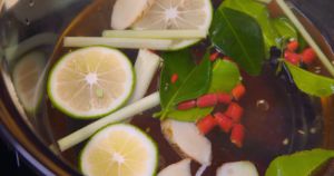 煮香料,在锅中放水,加入香茅草,良姜,柠檬叶和青柠檬煮出香味,然后把香料捞出来。