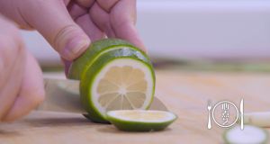 处理配菜,青柠檬洗净切片,香茅切片,红辣椒切碎,良姜切片。
