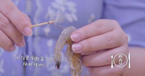 处理虾,鲜虾挑去肠线备用。虾在处理的时候,用牙签挑虾尾的倒数第二三节之前,很容易就拉出沙线。
