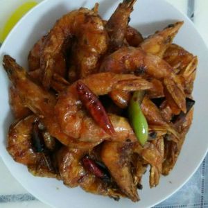 另起锅,倒入少许油,放葱姜蒜红辣椒煸炒,倒入炸好的虾,沿锅边倒入干煸四季豆剩下的料汁(酱油,盐,料酒,蚝油,糖和少许水)