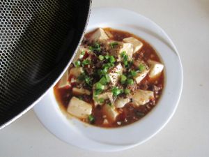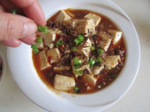 芡汁收到合适的程度后盛入碗中表面撒上花椒面和小葱末;