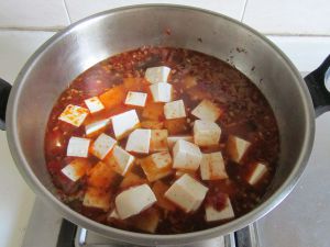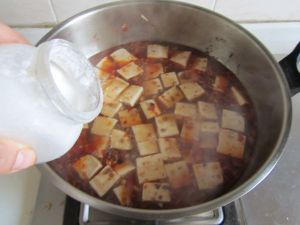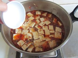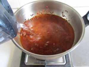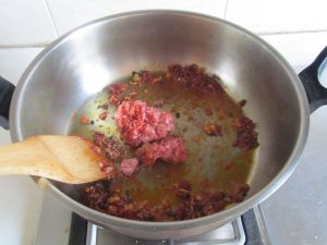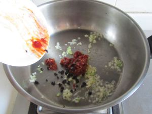 煸炒出香味后加入切碎的豆瓣酱和豆豉进去继续煸炒;
