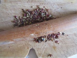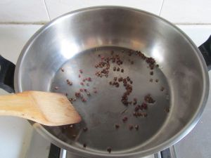炒出香味, 且表壳微微发焦后倒入再案板上用擀面杖碾压碎;