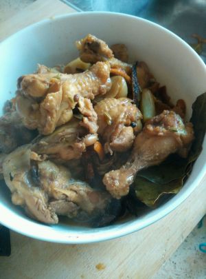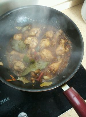 放入老酒,酱油各种香料,干辣椒,稍微加点清水,小火炖至20分钟即可