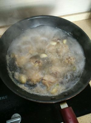 先放入大蒜和生姜,大火放入鸡根煮10到15分钟,然后捞出清水冲下鸡根