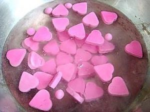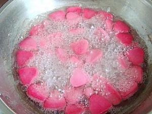 锅里倒入水,水开后,放入心形芋圆,用勺子搅拌几下,避免沾锅底。