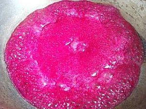 把火龙果汁和水倒入锅中,加入白糖,搅拌均匀。(白糖随个人口味适当添加)