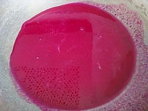 把沸腾的果汁水倒入盆中,边倒边用筷子搅拌。