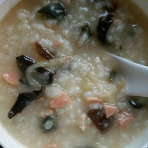 煮粥时可以往里面加几次凉水,这样可以加快煮粥时间而且可以使之变的香稠,煮到图片差不多时,把之前准备好的材料加到锅里。我是嫌瘦肉有腥味特意放黄酒炒过的,姜有去湿的功效,所以我也放了