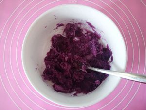 紫薯去皮洗净,切小块,放入沸水锅中大火蒸20分钟,用勺子压成紫薯泥,趁热加入糖粉拌匀。