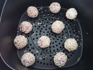 空气炸锅180℃预热5分钟,放入紫薯球,用刷子将紫薯球均匀地刷上一层油,烤约15~ 20分钟即可(制作过程中,可以拿出炸锅来回晃动,使紫薯球受热均匀)。