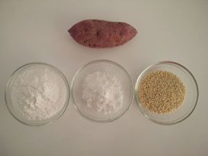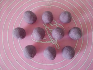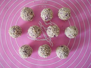 将紫薯球沾一遍清水,再沾一遍白芝麻。
