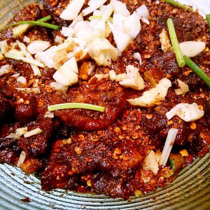 干辣椒面均匀洒满肉片上,花椒适量,鸡精盐适量,放上姜蒜碎和葱段