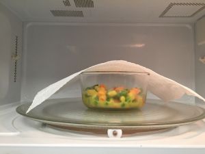 放入微波炉,上面盖一个保鲜膜(留一点儿缺口)或盖一张厨房用纸;转2分钟半左右即可,出炉小心烫