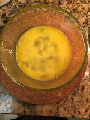 取一个鸡蛋,稍稍搅拌使蛋黄不再成型 (要用微波炉能用的碗啊)