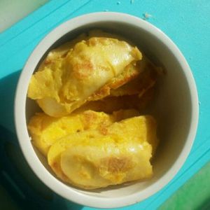 把馒头片放在蛋液里滚一滚。让馒头片均匀的沾上蛋液。