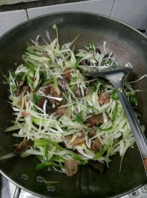 锅里放少量的油,因为腊肉炒的时候还会出油,太多油会很腻的,因为切很薄,随便炒一下就可以了。