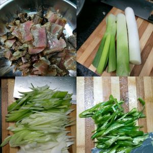 先把主要材料都切好,腊肉切的比较薄,辣椒跟大葱也可以按照你们自己喜欢的形状切。