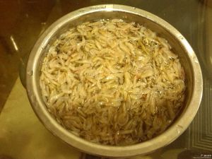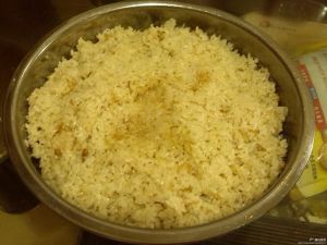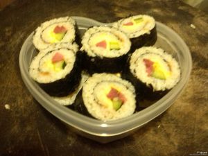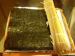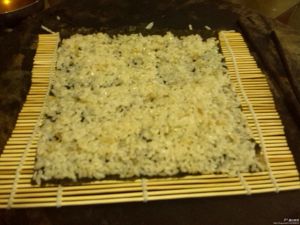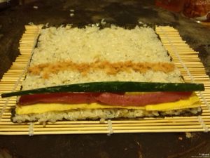 珍珠米饭煮好后,用筷子把它弄蓬松、这时给米饭加上少许盐、少许花生油、少许耗油、少许绵糖粉(没有绵糖粉白糖也是可以的)、醋(醋很关键,主要是米饭凉以后因为有醋调的关系、所以任何时候吃它都会很软)、最后把煸炒好的虾皮一起倒进去拌匀。(虾皮含钙很高,这样不但可以补钙还可以让寿司提鲜)拌匀以后一定要等到米饭变冷以后才开始包哦!要不海苔会不脆!