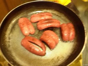 热狗对半切,小火煎至变色晾凉后再改用刀改切小细条。