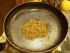用平底锅把洗净的虾皮焙干水份,放少许油小火煸炒至金黄。
