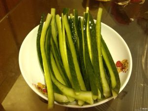 黄瓜切成细条状,最好长度是和海苔一样宽。
