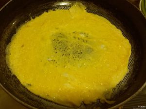 用平底锅把打散的鸡蛋煎成薄饼状,晾凉后再折叠切成条状。