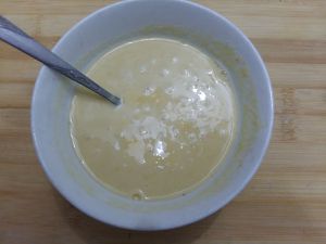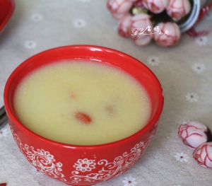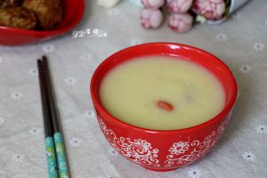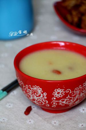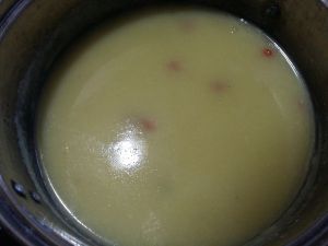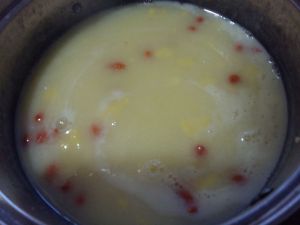 倒入烧开的锅里,注意一边倒一边用饭勺快速搅动,要不很快就会结块