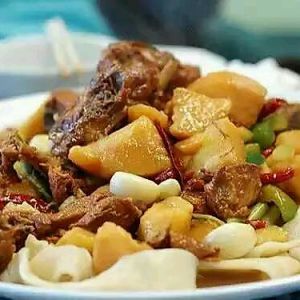 在热油锅中爆香蒜头、干辣椒、花椒、姜片、葱段,放入豆瓣酱炒出红油之后倒入鸡肉翻炒,加入酱油、老抽、糖、盐,待鸡肉炒熟上色后,加入土豆炒熟,倒入开水,没过鸡肉和土豆,中火慢炖收汁,汤汁收的差不多时,倒入青红辣椒炒熟,