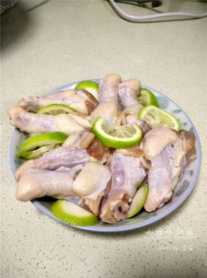 青柠檬洗净,往鸡翅根碗里挤出柠檬汁,然后切片,同鸡翅根拌在一起,腌制10分钟;