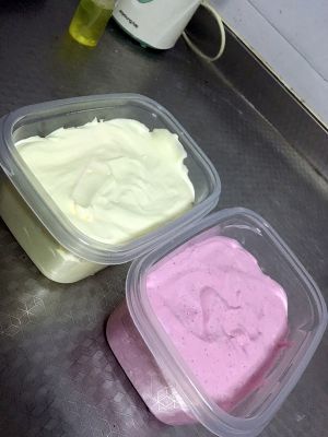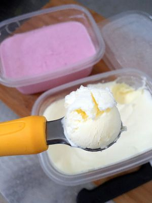我做了两种 一个原味一个火龙果味 将混合均匀的淡奶油倒入容器中放冰箱冷冻