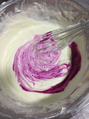 将蛋液放凉 倒入已经打发的淡奶油中 加入火龙果汁不停搅拌