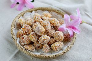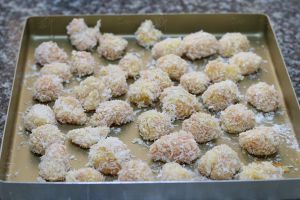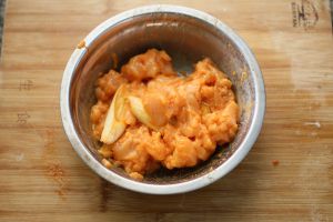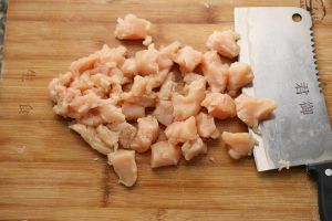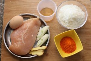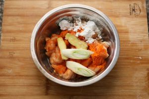 把鸡肉丁放在大碗里,加入烤肉料,1大勺淀粉,小半个鸡蛋液(2个鸡蛋打散,小半个腌肉,剩余的最后裹面包糠用),1大勺水,1汤匙料酒,再加上葱姜