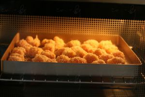 腌制好的鸡肉丁蘸一层全蛋液后滚一层面粉,再蘸蛋液,然后裹上面包糠