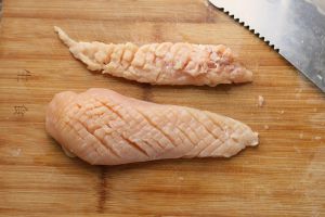 鸡胸肉清洗后,在两面切浅花刀,方便入味