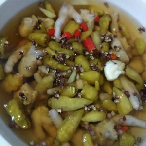 在碗中加入香糟卤,小米椒及小米椒水、花椒、八角、红辣椒、醋、盐、白糖适量泡制!这样就完成咯,只需要静候!