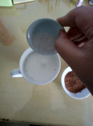 热好的牛奶搅拌一下让糖更彻底的融化,放入适量的可可粉