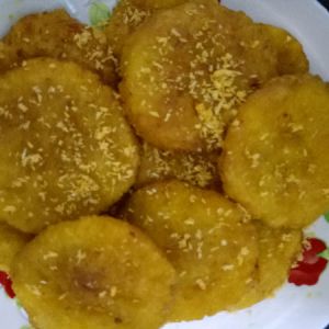 然后倒入油,将南瓜饼放入锅里,记住一定小火,成金黄色就可以出锅了,想好看一点撒上面包糠~☺☺