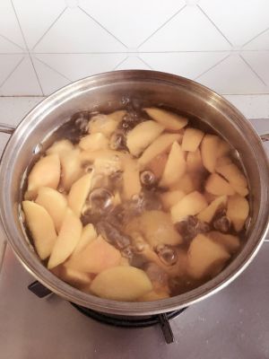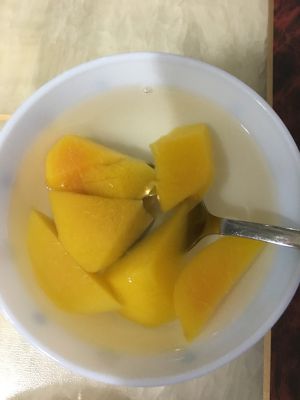 冰糖放入冷水煮沸,然后加入黄桃,大火烧开,小火炖20分钟。