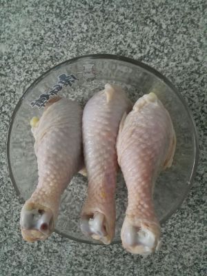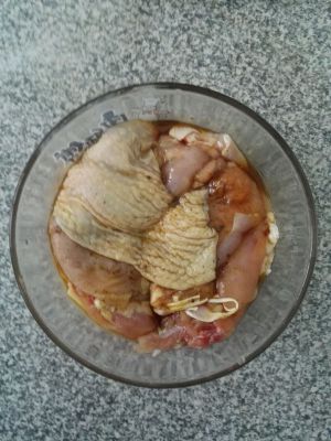 用厨房专用剪刀把鸡腿肉剪下来,过后用生抽与黑胡椒粉腌制鸡腿肉半个小时。