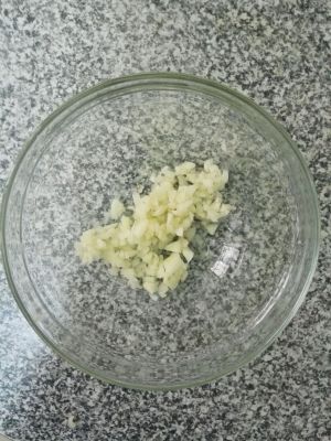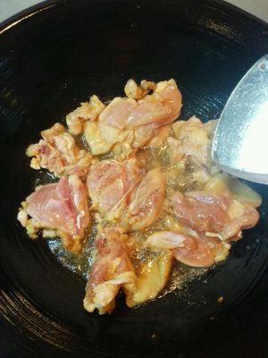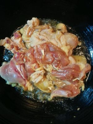 把鸡腿翻炒至黄色后,加入蒜沫再翻炒一会儿。