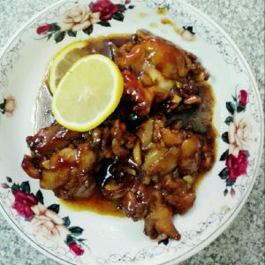 收汁以后,把锅中的鸡腿肉舀入盘中,挤一些柠檬汁在盘中,并放入几片柠檬做装饰☺