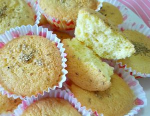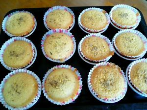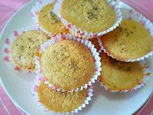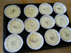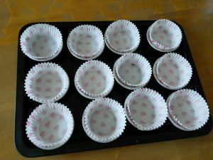 烤盘上放蛋糕模,里面放上纸托。当然用连体蛋糕模也行,有什么用什么。